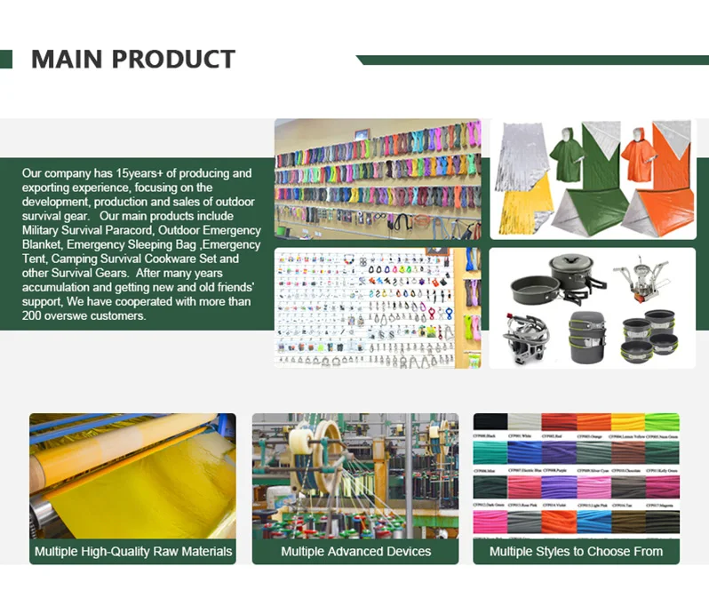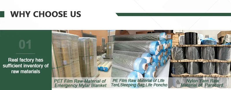 For example, PET film raw material for Emergency Mylar Blanket, PE film raw material for Life Tent, Emergency Sleeping Bag,Life Poncho, and also Nylon Yarn raw material for paracord production.