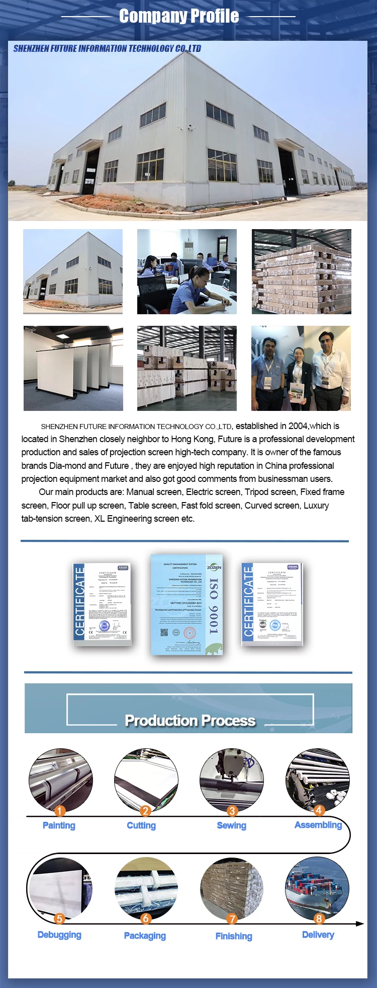A: Our factory mainly produces are: manual screen, electric screen, tripod screen, silver screen, fixed frame screen. floor stand